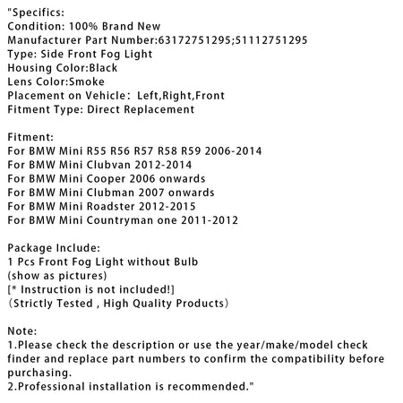 1 Pcs Front Stoßstange Nebel Licht Für Mini R55 R56 R58 R59 R60 63172751295 Rauch Objektiv