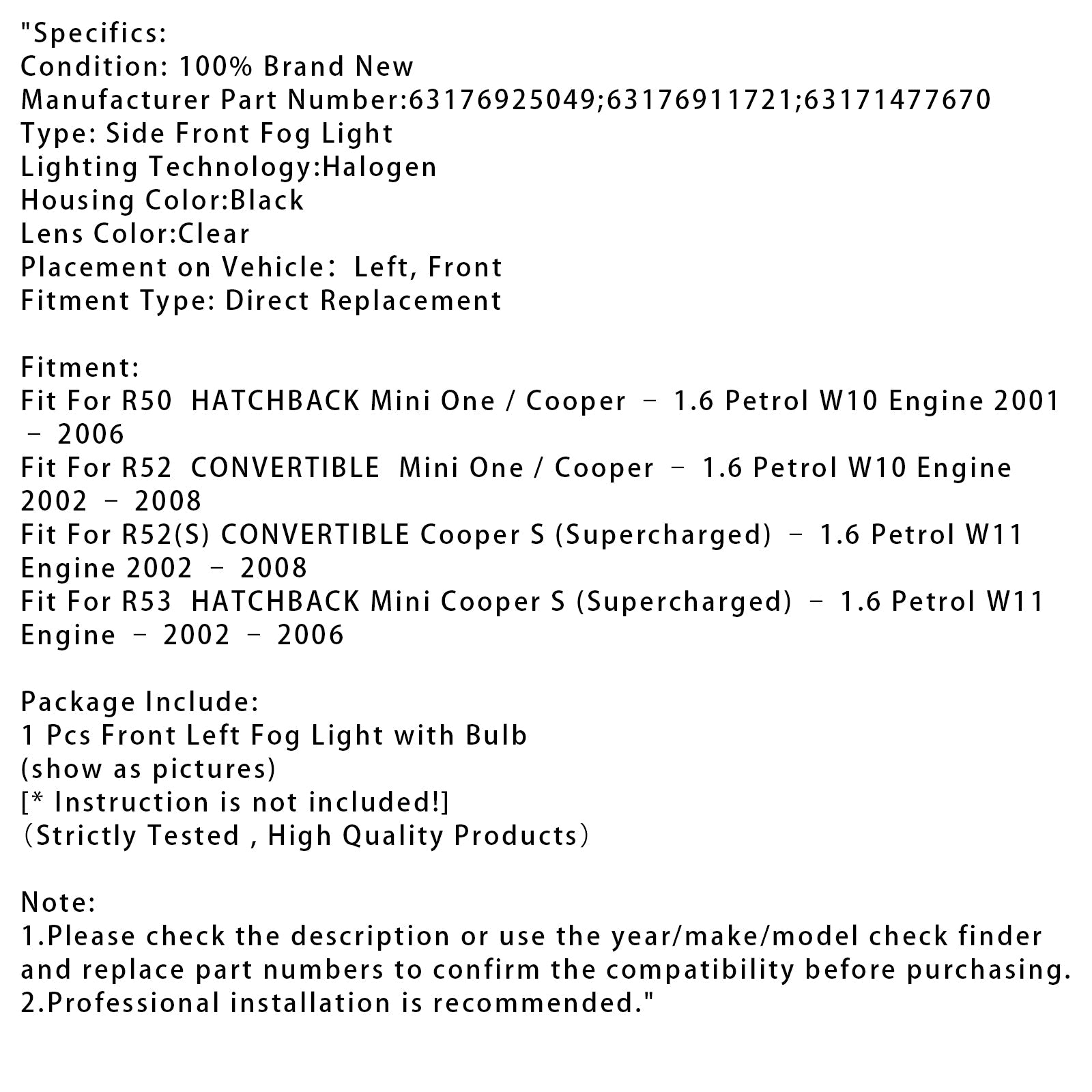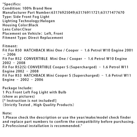 1 Pcs Front Stoßstange Links Nebel Licht Für Mini Cooper Eine R50 R52 R53 63176925049