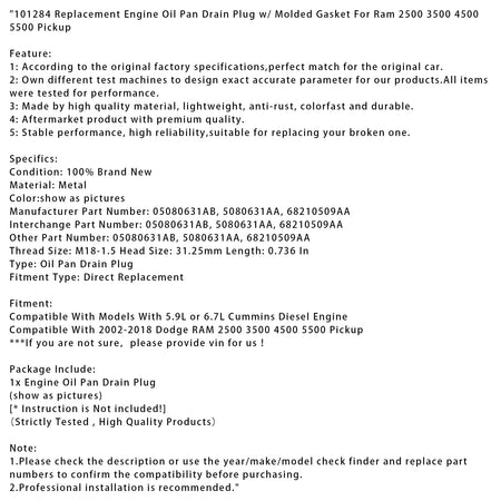 101284 Ersatz-Ölwannenablassschraube mit Formdichtung für Ram 2500, 3500, 4500 und 5500 Pickup