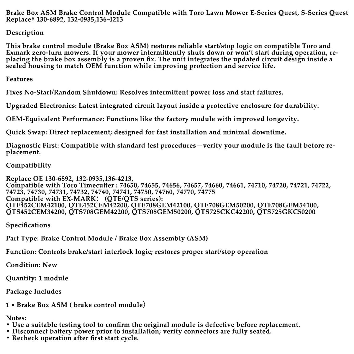 Brake Box ASM Bremssteuermodul Kompatibel mit Toro Rasenmäher E-Serie Quest, S-Serie Quest Ersetzt Nr. 130-6892, 132-0935,136-4213