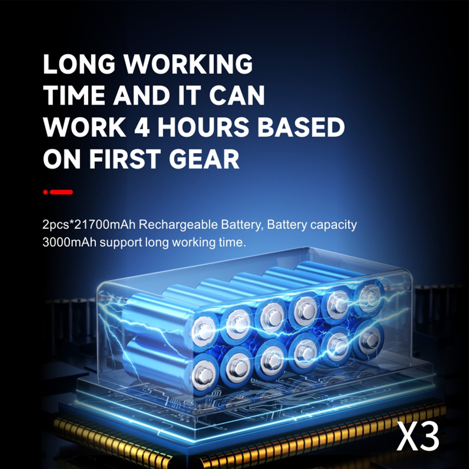 Die echte X3-Upgrade-Version des heftigen Turbofans verwendet einen bürstenlosen Gleichstrom-Hochgeschwindigkeitsmotor mit einer maximalen Ausgangsgeschwindigkeit von 130.000 U/min. Es kann extrem starke Windgeschwindigkeiten von bis zu 52 Metern pro Sekunde erzeugen, was einem Taifun mit 16 Ebenen entspricht. Es ist leistungsstark, langlebig und stabil und verbrennt auch bei l?ngerer Belastung nicht. Es verfügt au?erdem über Ladeschutz- und überhitzungsschutzfunktionen. Es hat eine lange Akkulaufzeit von bis zu 4 Stunden in einem Gang. Es verfügt über zwei eingebaute 21700-Akkus mit einer Akkukapazit?t von 3000 mAh, wodurch es l?nger h?lt! Es kann die Geschwindigkeit in drei G?ngen anpassen, was Ihnen ein anderes Erlebnis bietet.