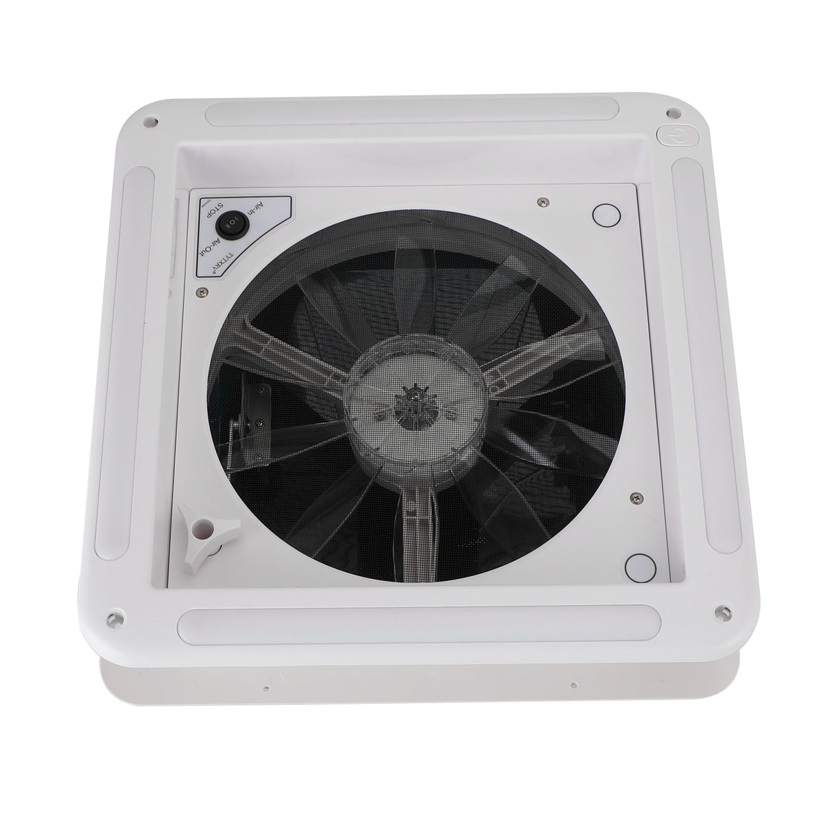 The Air In/Out button function uses the fan's air in/out buttons to reverse the direction of the fan. To change the direction of the fan, simply push a button to make airflow into or out of the RV.