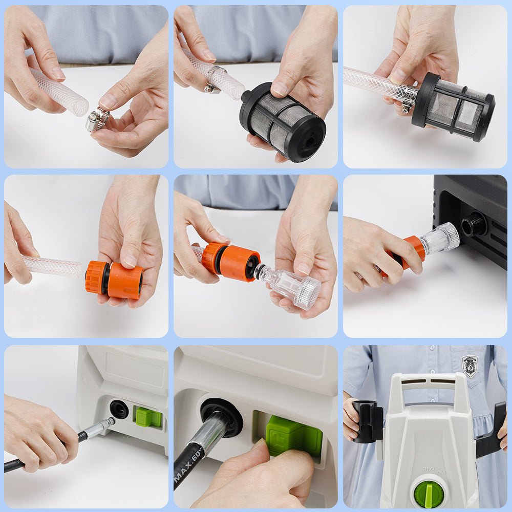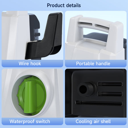 【Hochdruckreiniger】: Leistungsstarker 1400-Watt-Universalmotor, erzeugt maximal bis zu 3200 PSI und 1,8 GPM Wasserdurchfluss. Kompaktes Design und kann jederzeit überallhin mitgenommen werden. Und langer Hochdruckschlauch für gr??ere Reichweite. Der Schlauch kann an der Maschine aufgeh?ngt werden. Das Netzkabel kann am Netzkabelhalter aufgeh?ngt werden.