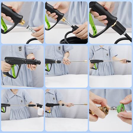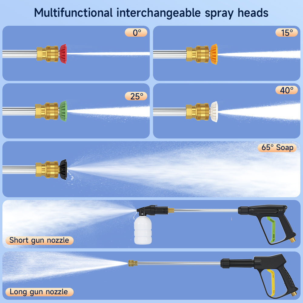 Die Reinigungsmaschine ist mit zwei Spritzpistolen ausgestattet, von denen eine die Wassermenge nach Belieben einstellen kann (normalerweise zum Autowaschen verwendet) und die andere mit verschiedenen Düsentypen ausgestattet werden kann. Kurz gesagt, der Kauf unserer Produkte kann alle Ihre Reinigungsanforderungen erfüllen
