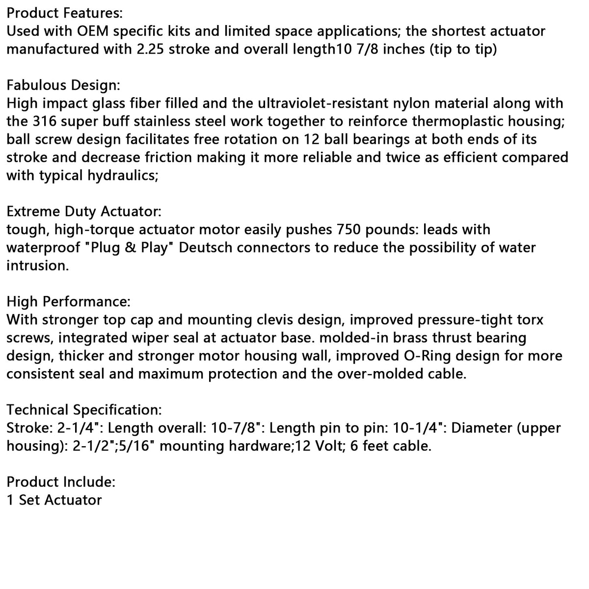 Der robuste Aktuatormotor mit hohem Drehmoment schiebt problemlos 750 Pfund (340 kg). Die Leitungen sind mit wasserdichten ?Plug & Play“-Deutsch-Anschlüssen ausgestattet, um das Eindringen von Wasser zu verhindern.