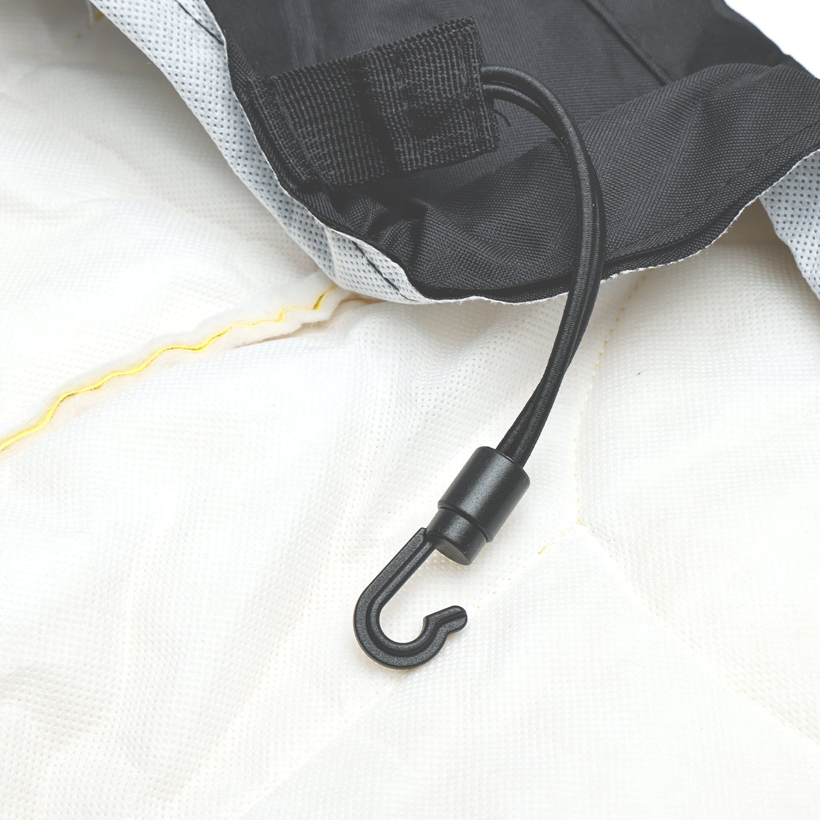 Elastische Kordelstopper um das Sicherheitsschild an der Rückenlehne.
