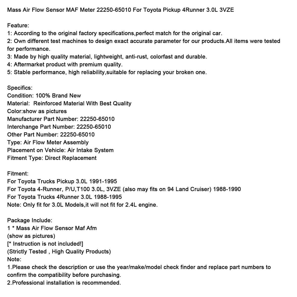 Luftmassenmesser MAF Meter 22250-65010 Für Toyota Pickup 4Runner 3.0L 3VZE