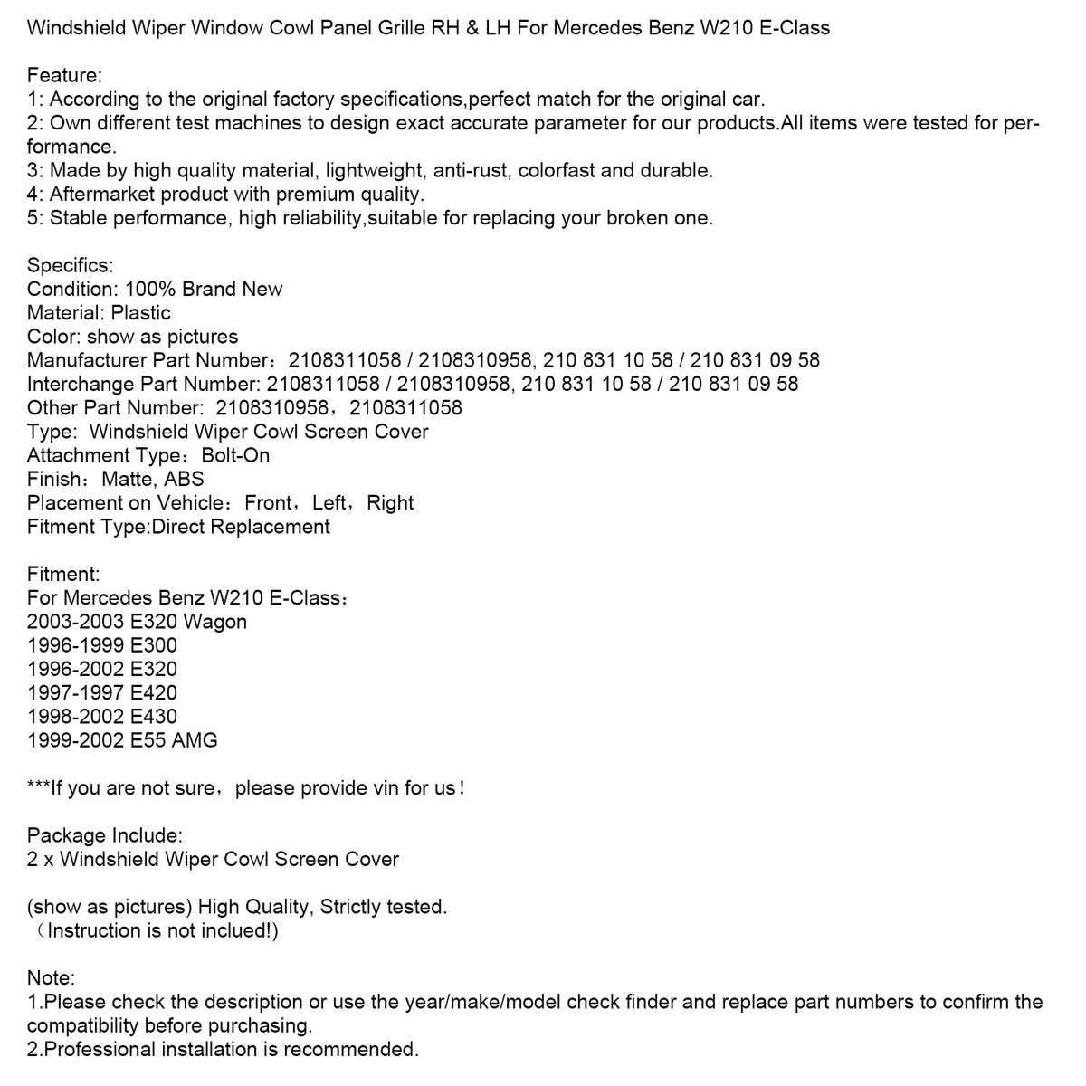 Scheibenwischer Fenster Gugel Panel Grille RH & LH Fit Für Mercedes Benz W210 E-Klasse