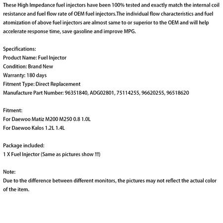 1 STÜCKE Kraftstoffinjektor 96620255 Fit Chevrolet Fit Daewoo Matiz 0.8L 1.0L 96518620