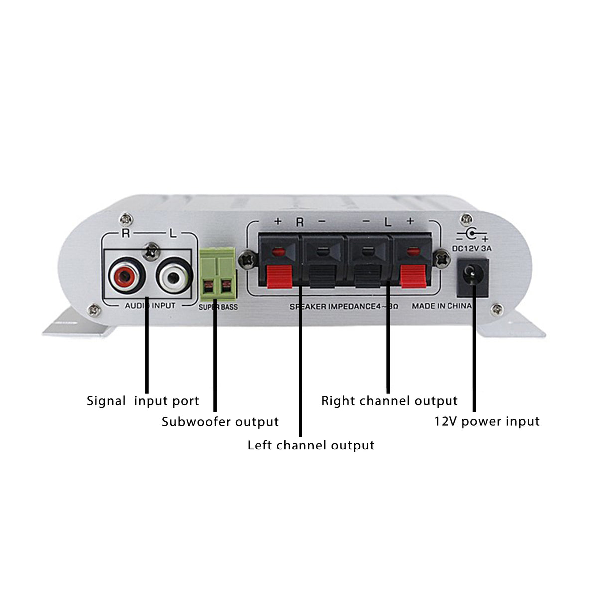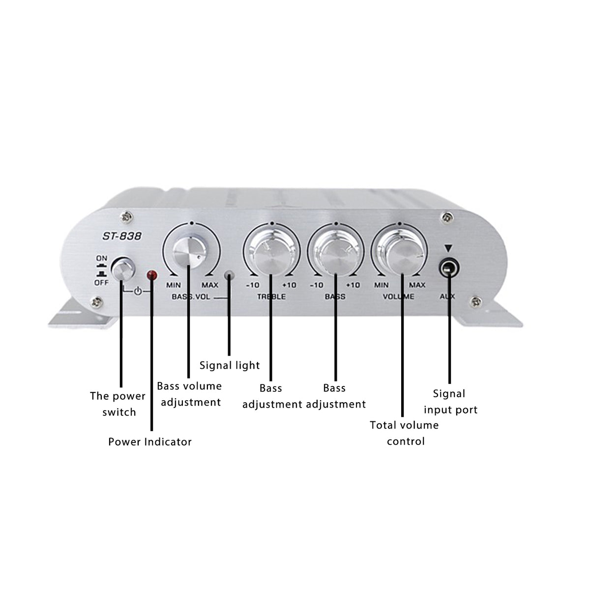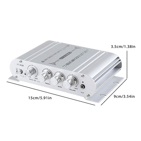 2.1 Stereo Hifi Car Home car audio car Amplifier Amp Sound Speaker EDR Audio LED Design amplifiers - YouTube Video will open in a new window English 2.1 Stereo Hifi Car Home car audio car Amplifier Amp Sound Speaker EDR Audio LED Design amplifiers Specifications: Model: ST-838 Color: As the pictures shown Material: Aluminum Alloy Size: 15X9X3.5MM Bluetooth: Not Support Input voltage: DC 12V/2A AC 220V(If Input voltage is AC 220V.You need use 220v transform to 12v Power Adapter) RMS power:? 20WX2+40W Max power: 200W+200W Channel: 2.1 power amplifier, can connect 2 speakers and a subwoofer Rated frequency: 20-20KHZ Resolution: 47K Distortion rate: 0.4% Signal to noise ratio: 80dB Impedance: 4-8 ohm Power amplifier type: HIFI power amplifier Interface type: Clip Receiving method: Audio input Weight: 0.3KG Channel: 2.1 channel Features: -Mini HIFI digital audio power amplifier. - Aluminum alloy body, durable, the body is made of aluminum alloy once, the anode surface treatment, the overall atmospheres, thick, feel is also very good. -Low distortion supplies a clearer, stronger and more powerful sound. - Two main channel output.can connect 2 speakers and a subwoofer -The sound quality is very good, the bass is strong Package Included: 1 x Power Amplifier 1 x User Manual Deutsch 2.1 Stereo Hifi Car Home Auto Audio Auto Verst?rker Amp Sound Lautsprecher EDR Audio LED Design Verst?rker Spezifikationen: Modell: ST-838 Farbe: Wie auf den Bildern gezeigt Material: Aluminiumlegierung Gr??e: 15 x 9 x 3,5 mm Bluetooth: Nicht unterstützt Eingangsspannung: DC 12V / 2A AC 220V (Wenn die Eingangsspannung AC 220V ist. Sie müssen eine 220V-Transformation zum 12V-Netzteil verwenden) Effektivleistung: 20WX2 + 40W Maximale Leistung: 200 W + 200 W. Kanal: 2.1 Leistungsverst?rker, kann 2 Lautsprecher und einen Subwoofer anschlie?en Nennfrequenz: 20-20 kHz Aufl?sung: 47K Verzerrungsrate: 0,4% Signal-Rausch-Verh?ltnis: 80 dB Impedanz: 4-8 Ohm Leistungsverst?rkertyp: HIFI-Leistungsverst?rker Schnittstellentyp: Clip Empfangsmethode: Audioeingang Gewicht: 0,3 kg Kanal: 2.1 Kanal Eigenschaften: -Mini HIFI digitaler Audio-Leistungsverst?rker. - Aluminiumlegierungsk?rper, langlebig, der K?rper ist einmal aus Aluminiumlegierung gefertigt, die Anodenoberfl?chenbehandlung, die Gesamtatmosph?re, dick, fühlen sich auch sehr gut an. - Geringe Verzerrung sorgt für einen klareren, st?rkeren und kraftvolleren Klang. - Zwei Hauptkanalausg?nge k?nnen 2 Lautsprecher und einen Subwoofer anschlie?en -Die Klangqualit?t ist sehr gut, der Bass ist stark Lieferinhalt: 1 x Leistungsverst?rker 1 x Benutzerhandbuch
