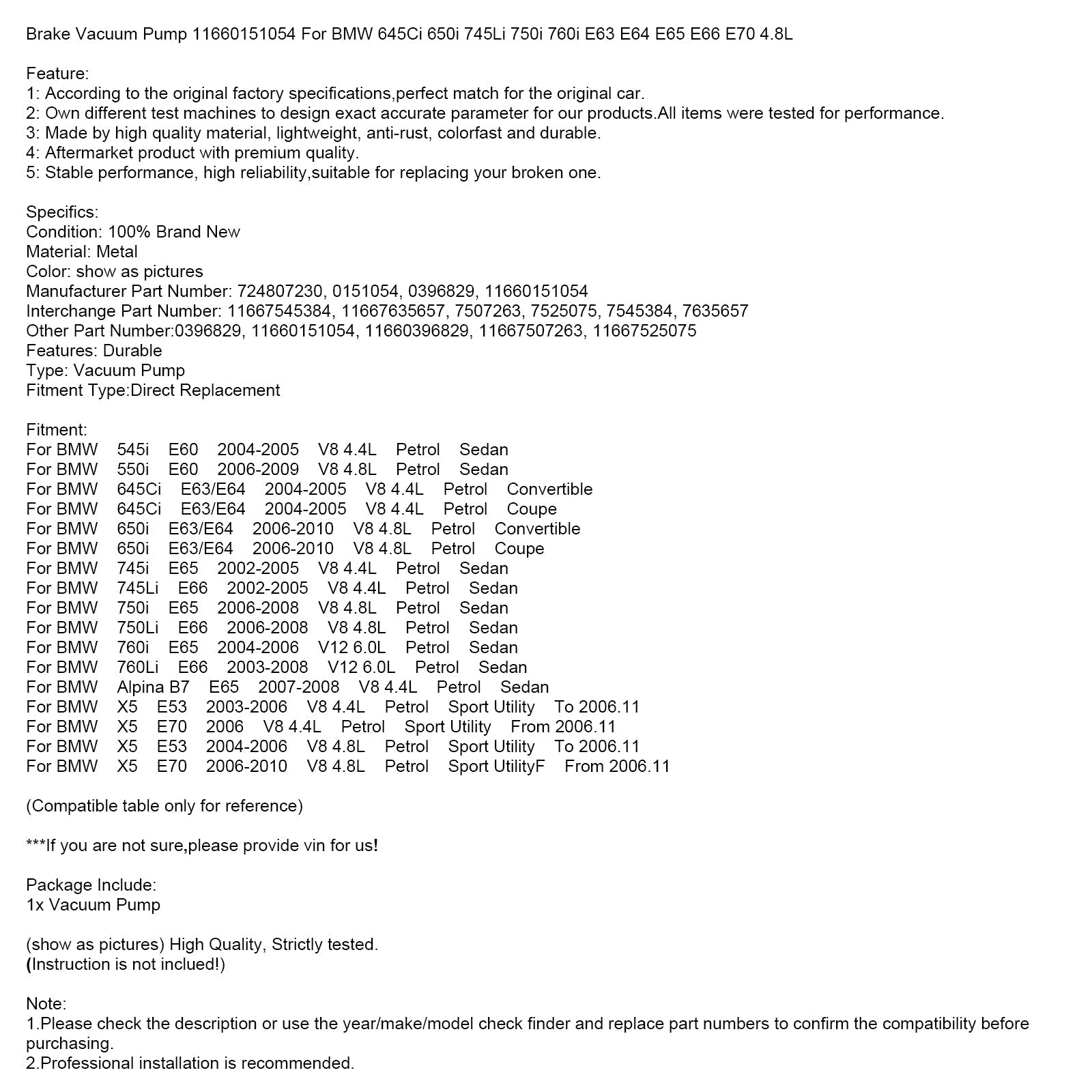 Bremsvakuumpumpe 11660151054 Passend für BMW 645Ci 650i 745Li 750i 760i E63 E64 E65 E66 E70 4.8L