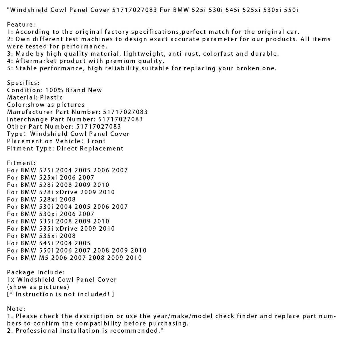 Windschutzscheiben-Gurt-Panel-Abdeckung 51717027083 Passend für BMW 525i 530i 545i 525xi 530xi 550i
