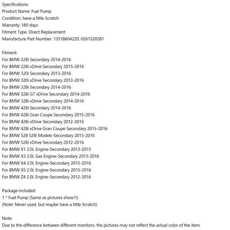 2012-2016 BMW 428i 528i xDrive Secondary Z4 2.0L Hochdruckkraftstoffpumpe 13518604229 0261520281