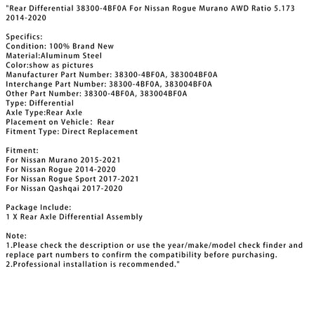 Hinterachsdifferential 38300-4BF0A Für Nissan Rogue Murano AWD Verhältnis 5,173 2014-2020