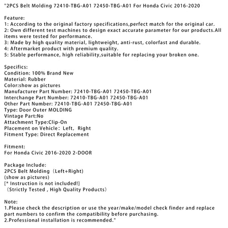 2PCS Gürtel Form 72410-TBG-A01 72450-TBG-A01 Für Honda Civic 2016-2020