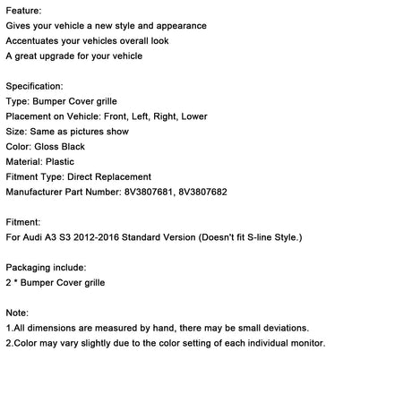 2 STÜCKE Frontstoßstange Nebelscheinwerfer Abdeckung Kühlergrill Grill Fit Audi A3 2012-2016