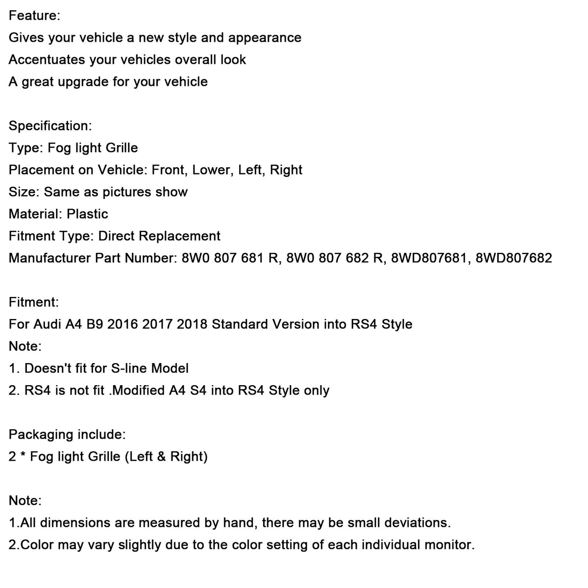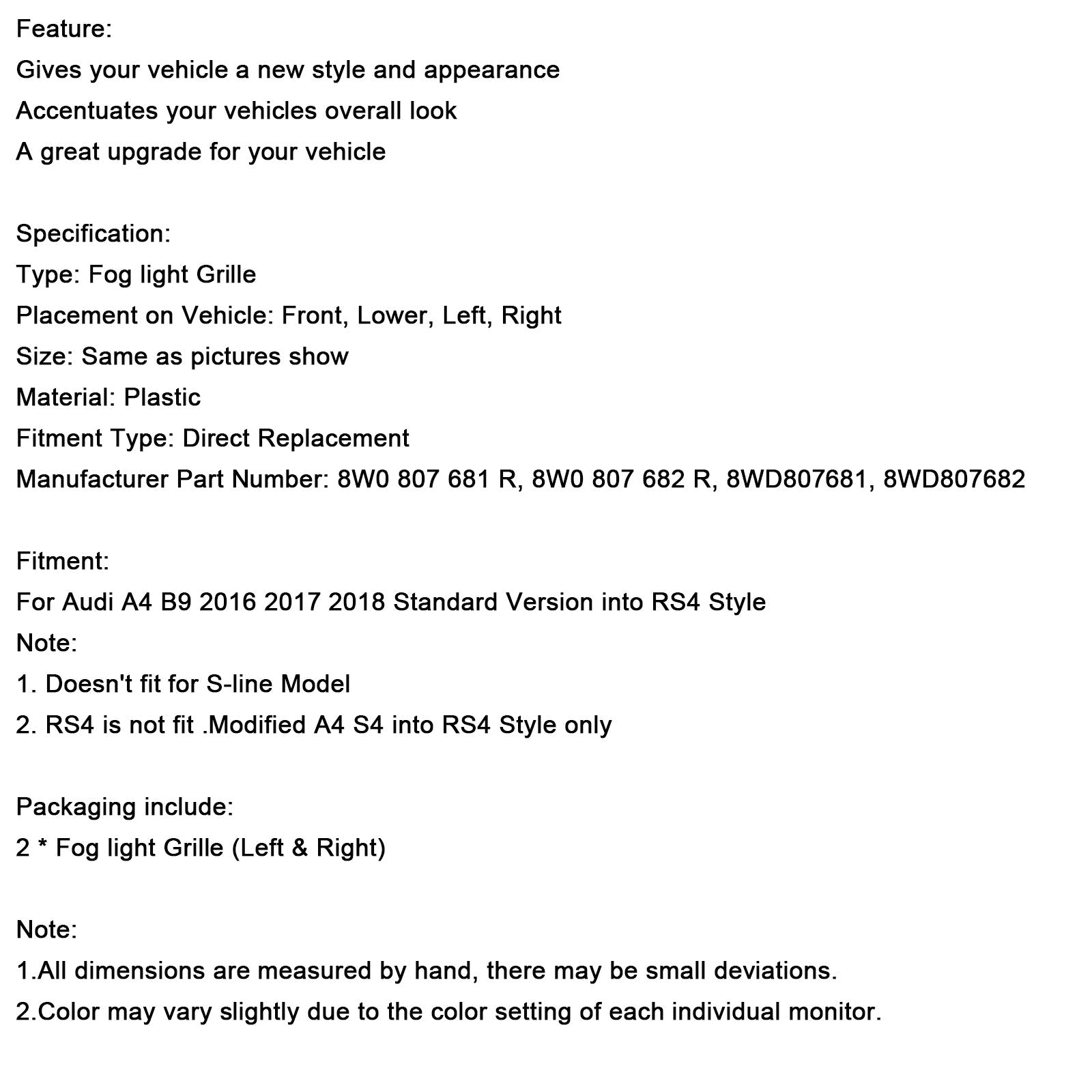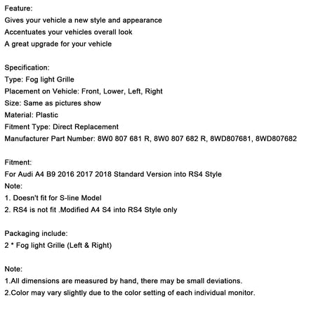 2 STÜCKE Nebelscheinwerfer Grill Unteren Stoßfänger Grille Fit AUDI A4 B9 2016-2018