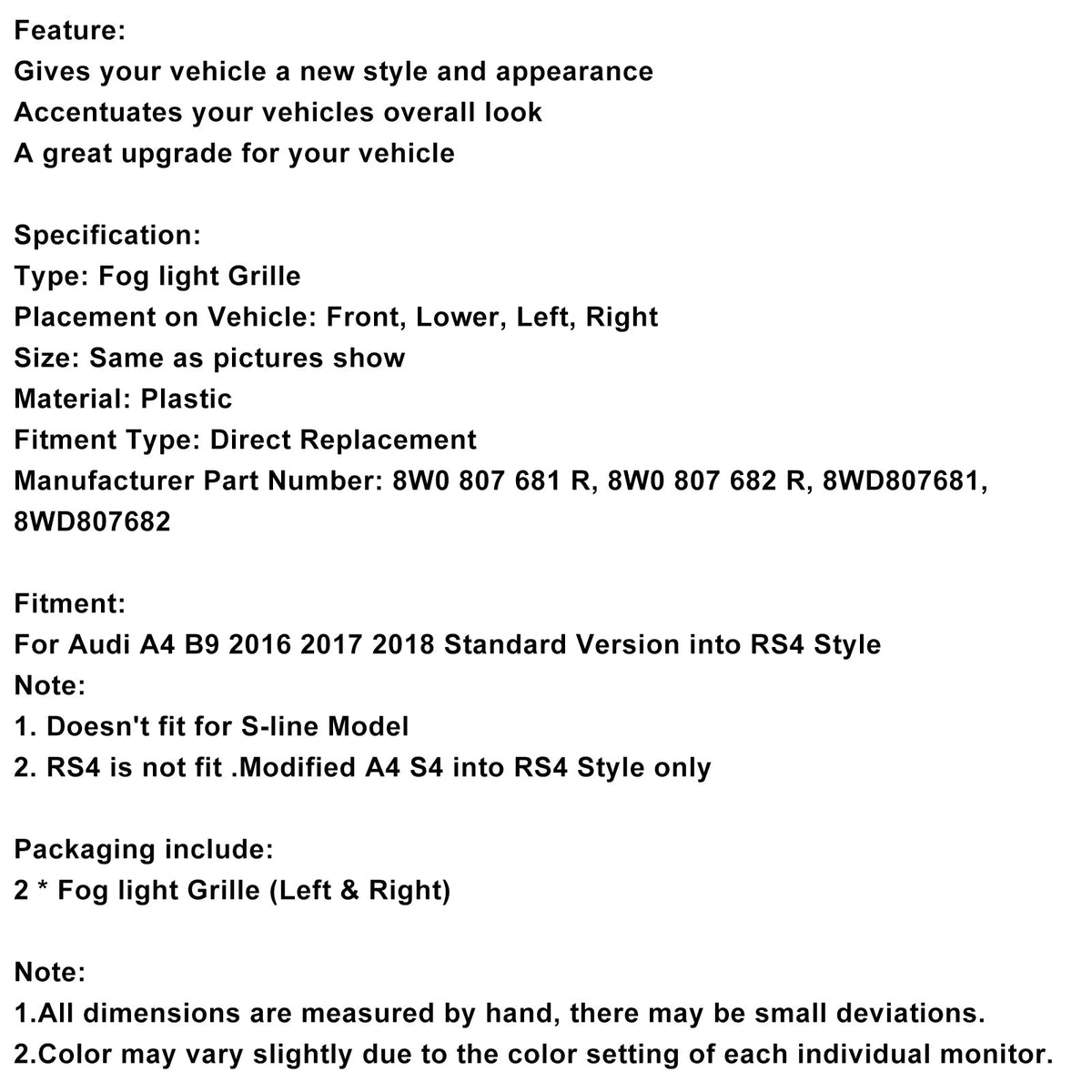 2 STÜCKE Nebelscheinwerfer Kühlergrill Unteren Stoßfänger Grill Fit AUDI A4 B9 2016-2018