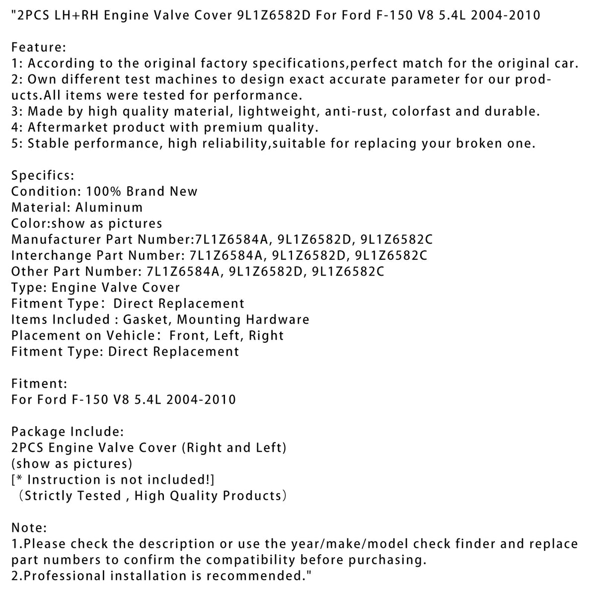 2004-2010 Ford F-150 V8 5.4L 2PCS LH+RH Motorventildeckel 9L1Z6582D