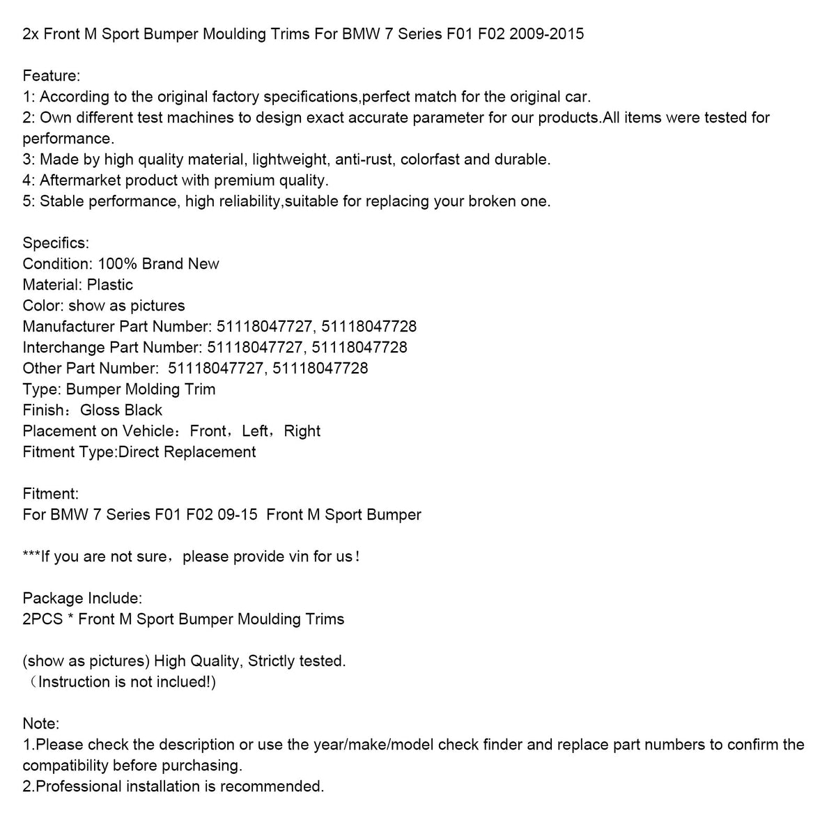 2x Front M Sport Sto?f?nger Zierleisten Fit für BMW 7 Serie F01 F02 2009-2015
