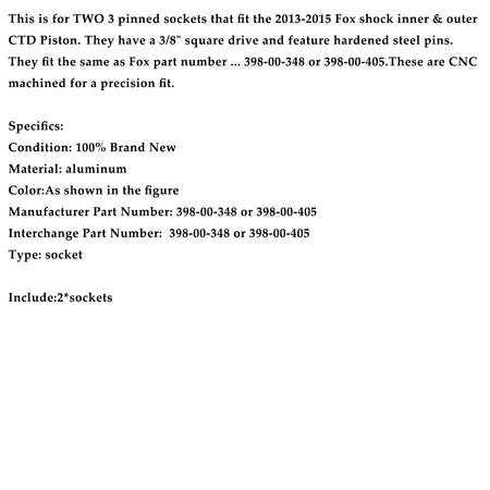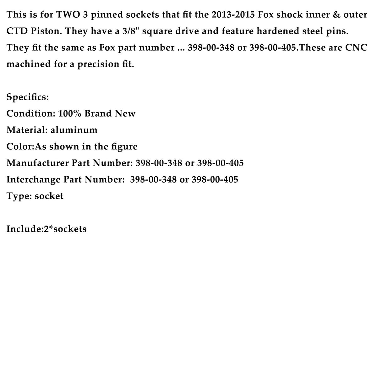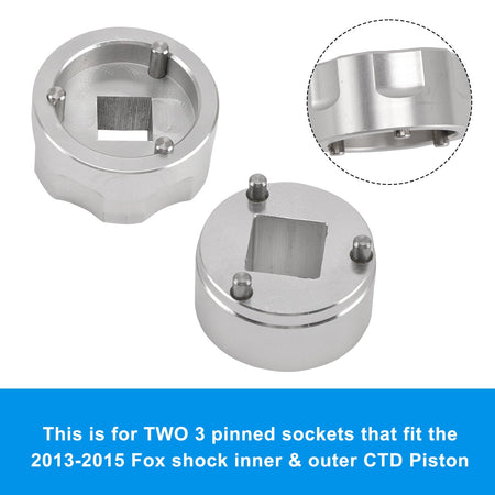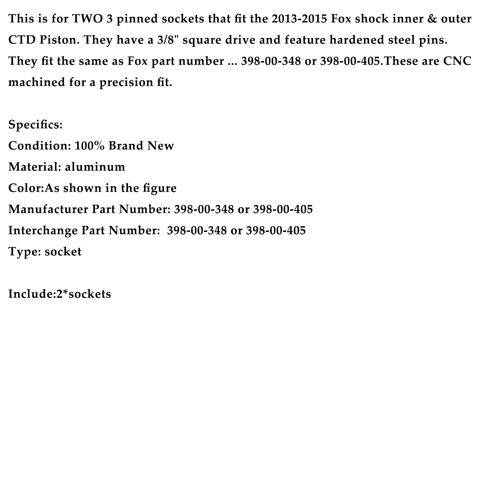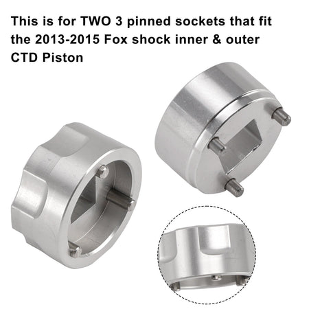 Dies ist für ZWEI 3-Stift-Steckschlüssel, die für den inneren und äußeren CTD-Kolben des Fox-Stoßdämpfers 2013–2015 geeignet sind. Sie haben einen 3/8-Zoll-Vierkantantrieb und sind mit gehärteten Stahlstiften ausgestattet. Sie passen auf die gleiche Fox-Teilenummer wie ... 398-00-348 oder 398-00-405. Sie sind CNC-gefräst für eine präzise Passform.