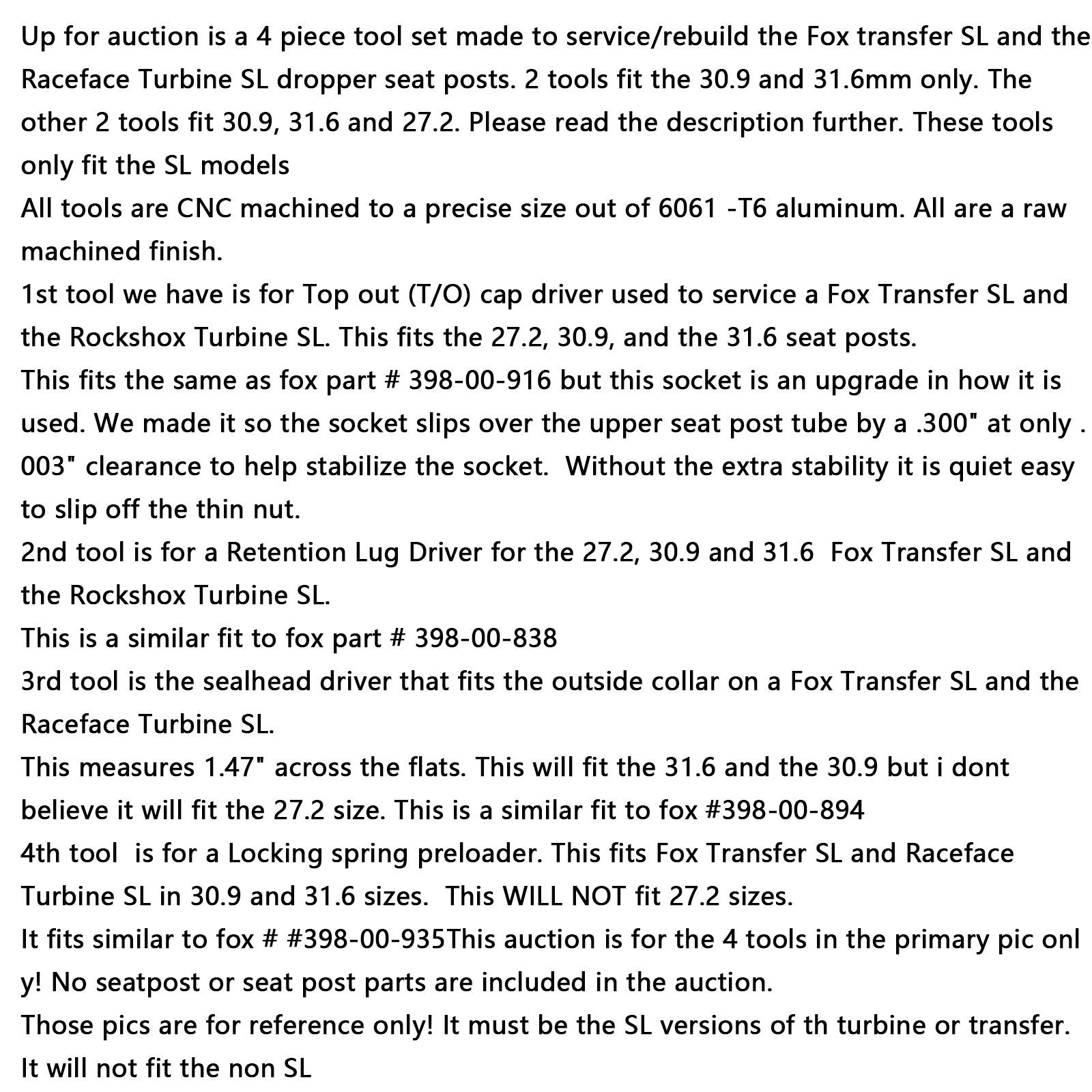 Zur Versteigerung steht ein 4-teiliges Werkzeugset für die Wartung und Überholung der Fox Transfer SL und Raceface Turbine SL Teleskop-Sattelstützen. Zwei Werkzeuge passen nur für 30,9 und 31,6 mm. Die anderen beiden Werkzeuge passen für 30,9, 31,6 und 27,2 mm. Bitte lesen Sie die Beschreibung weiter. Diese Werkzeuge passen nur für die SL-Modelle.