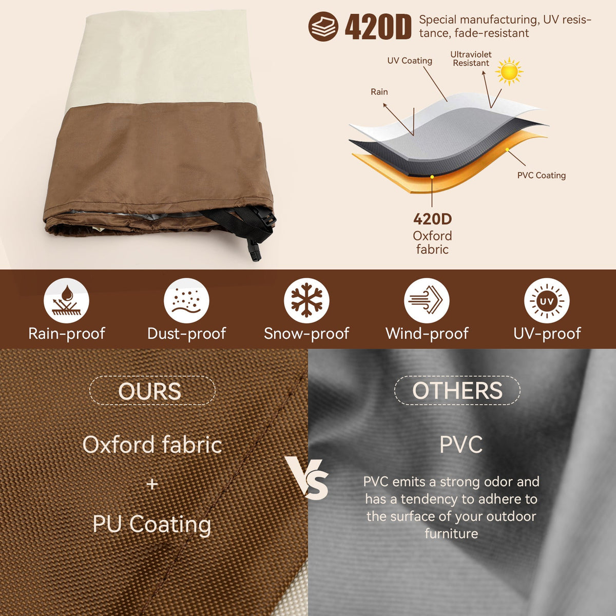 Nachdem Sie nun den perfekten Tisch und die Stühle für den Außenbereich erworben haben, können im Winter auch schneesichere Cremes, Staub- und Sonnenschutz im Sommer und Herbst verhindern, dass uns abgefallene Blätter zu schaffen machen. Es kann auch Staub verhindern, hat viele Funktionen und ist in vier Jahreszeiten universell einsetzbar. Hergestellt aus wasserdichtem 420D Oxford-Stoff. Dieser mehrschichtige Bezug verfügt über winzige Perforationen für Luftzirkulation und Atmungsaktivität sowie ultraschallgeschweißte Nähte, um Staub, Schmutz, Sonne, Regen und Schnee fernzuhalten. Dieses leichte Design ist so konzipiert, dass es die meisten Standard-Terrassen-Essgarnituren abdeckt, und verfügt über verstärkte Befestigungsbänder für eine gute Passform.