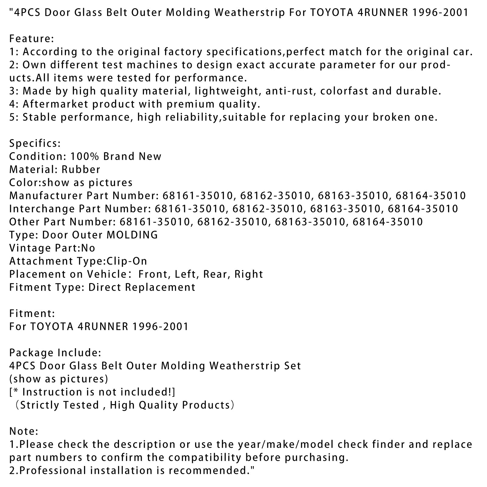 1996-2001 TOYOTA 4RUNNER 4 STÜCKE Türglas Gürtel Äußere Formteil Dichtungsstreifen