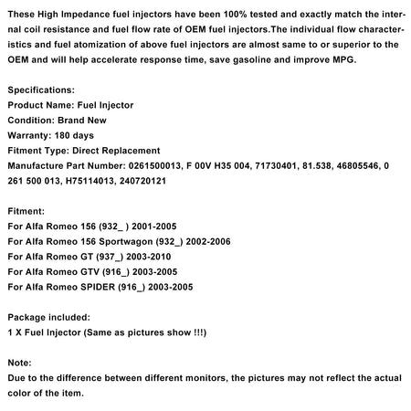 4 STÜCKE Kraftstoffinjektor 0261500013 Passend für Alfa Romeo 156 932 GT 937 GTV Spider 916 2.0