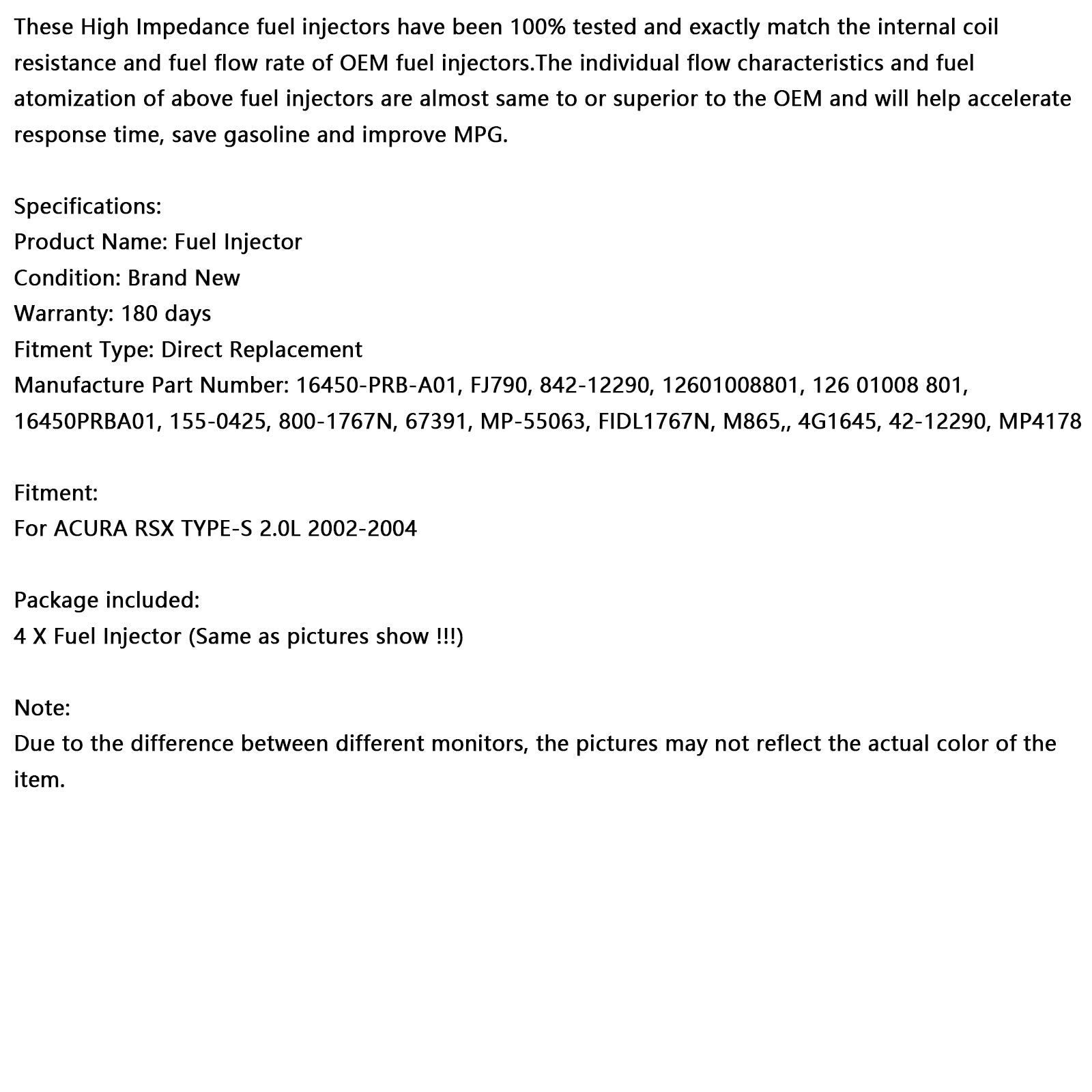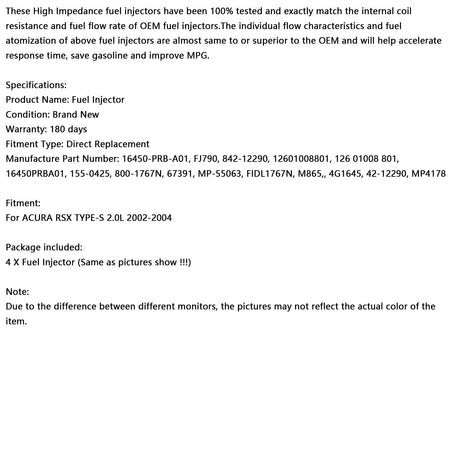 4PCS Kraftstoff Injektor 16450-PRB-A01 Fit Acura RSX TYPE-S 2,0 L 2002-2004 842-12290