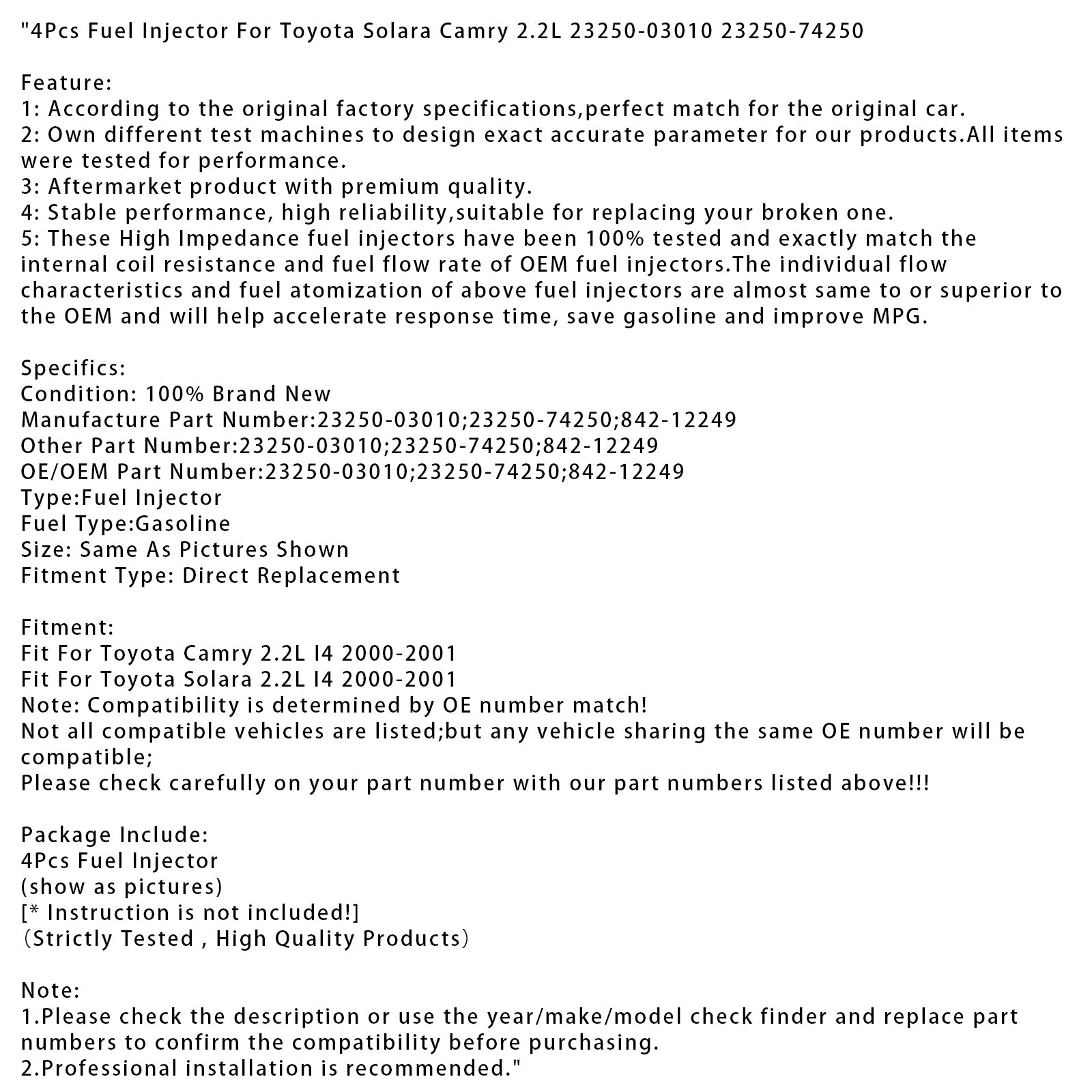 4 Stück Kraftstoffeinspritzdüsen für Toyota Solara Camry 2.2L 23250-03010 23250-74250