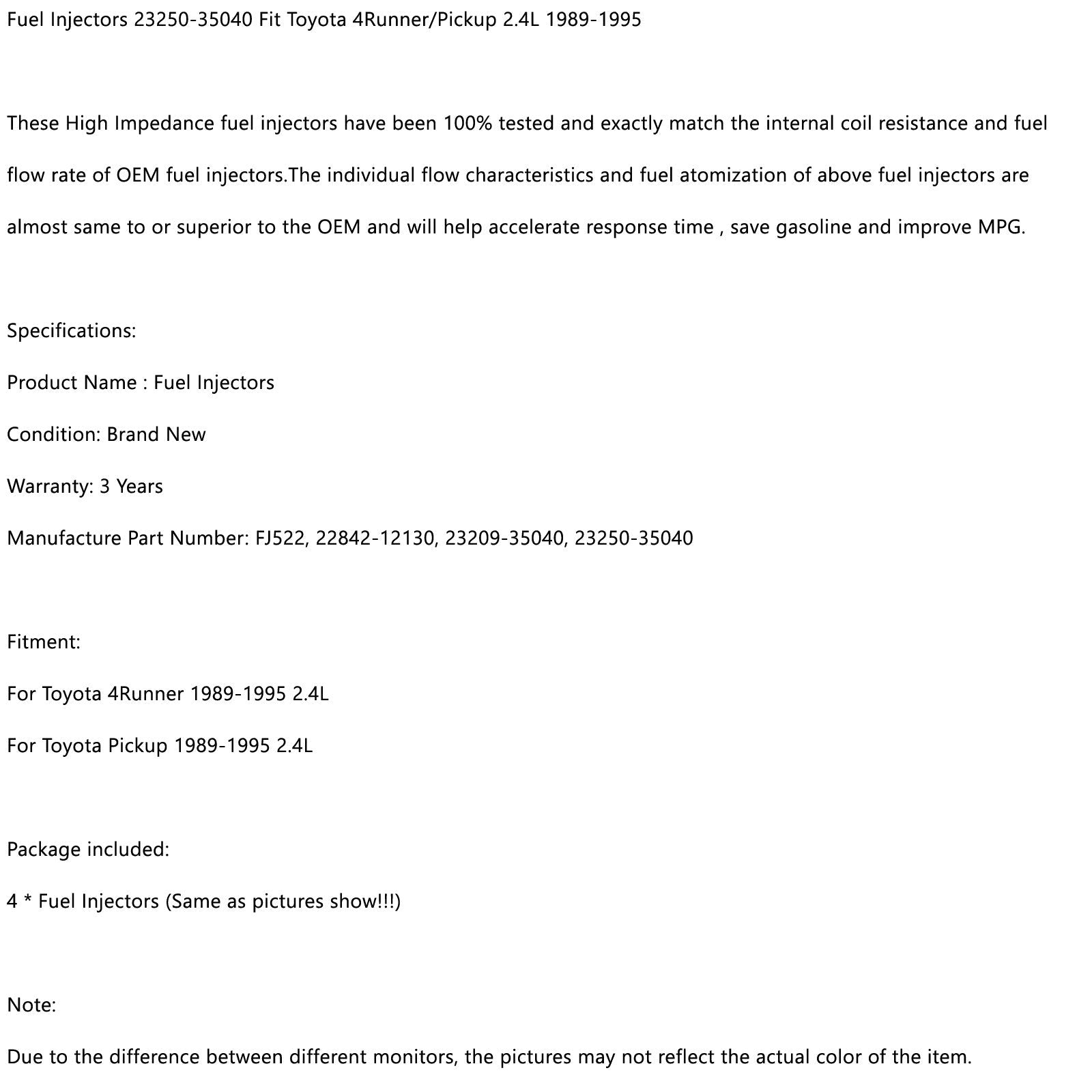 4-teilige Einspritzdüsen 23250–35040 passend für Toyota 4Runner/Pickup 2,4 l 1989–1995 generisch