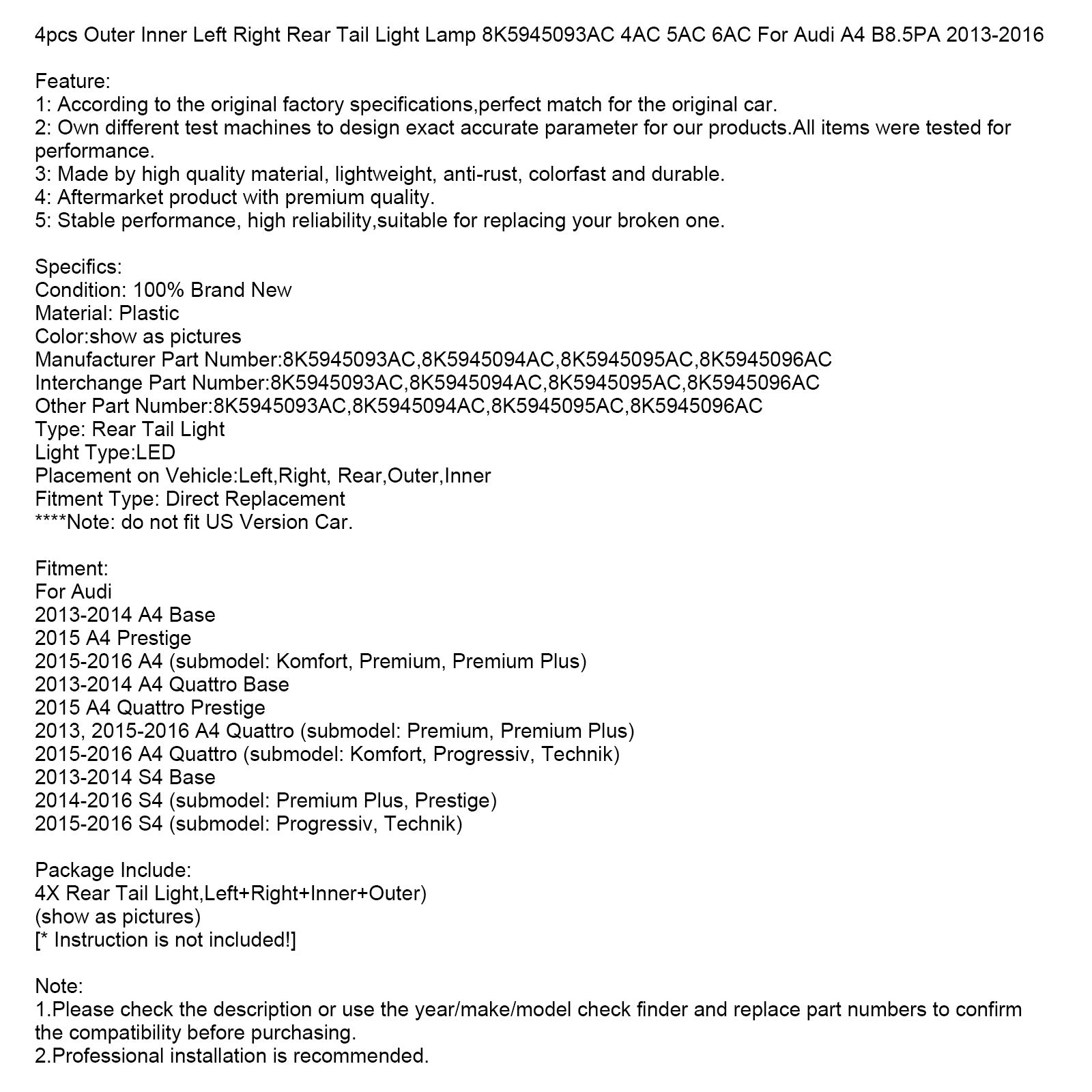 4 stücke Außen Innen Links Rechts Hinten Schwanz Licht Lampe Fit Für Audi A4 B8.5PA 2013-2016 8K5945093AC 4AC 5AC 6AC