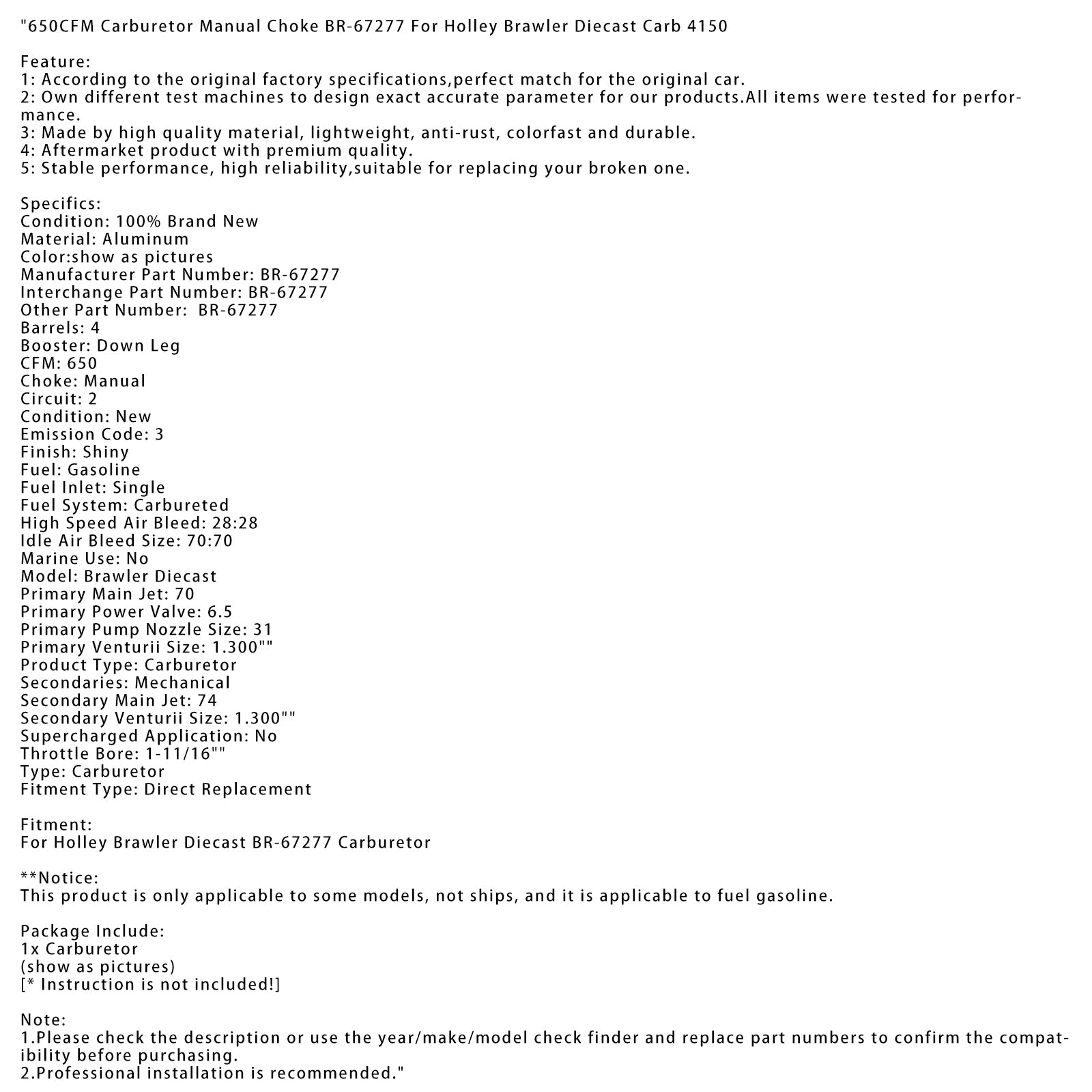 650CFM Vergaser Manuelle Choke BR-67277 Für Holley Brawler Diecast Carb 4150