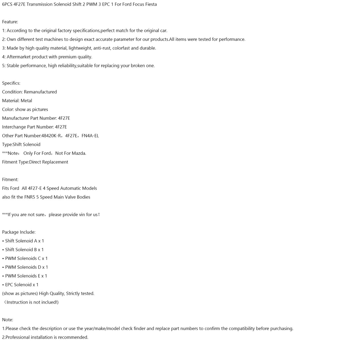 6PCS 4F27E Transmission Solenoid Shift 2 PWM 3 EPC 1 For Ford Focus Fiesta