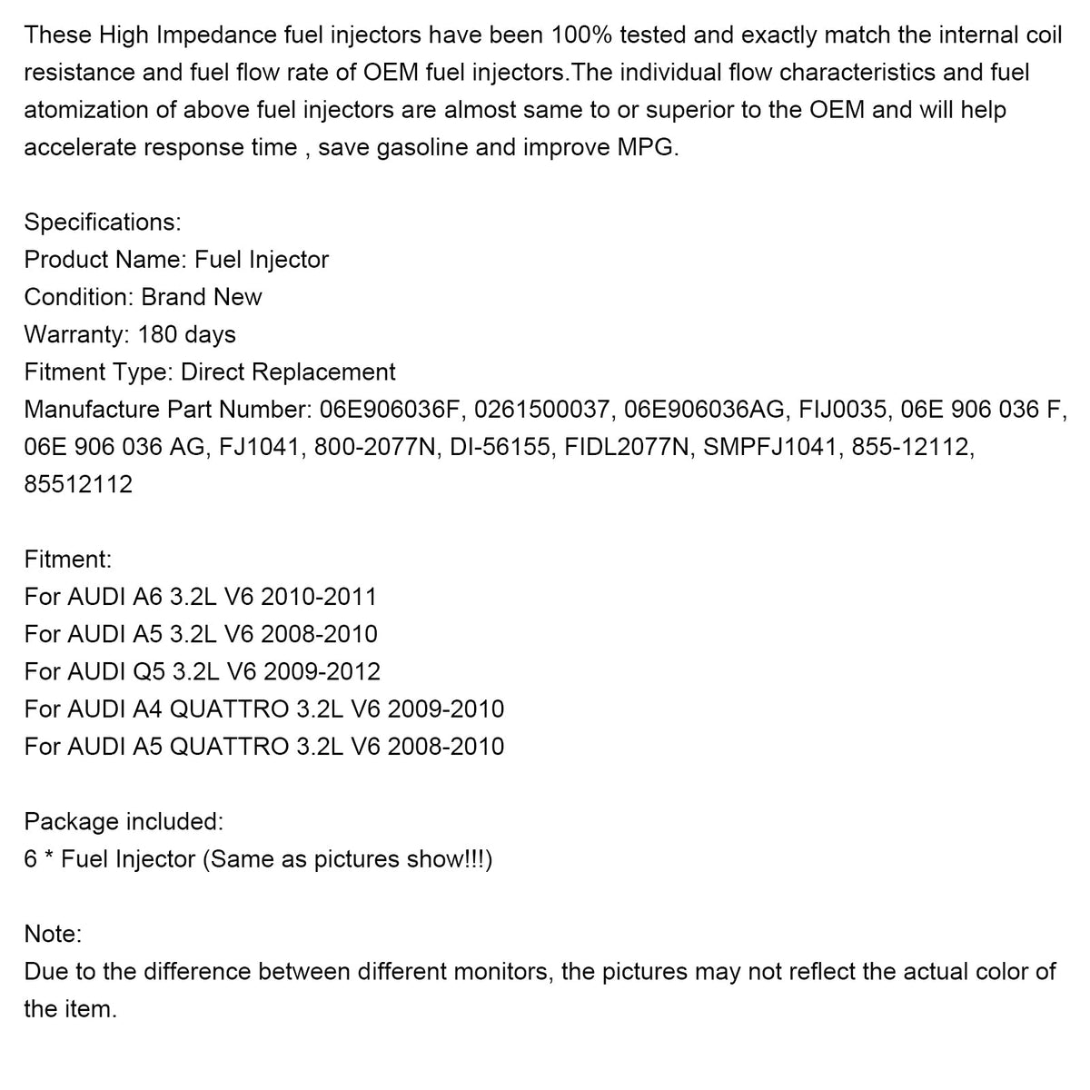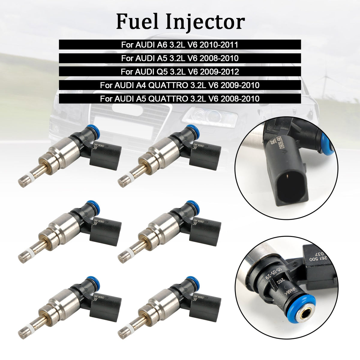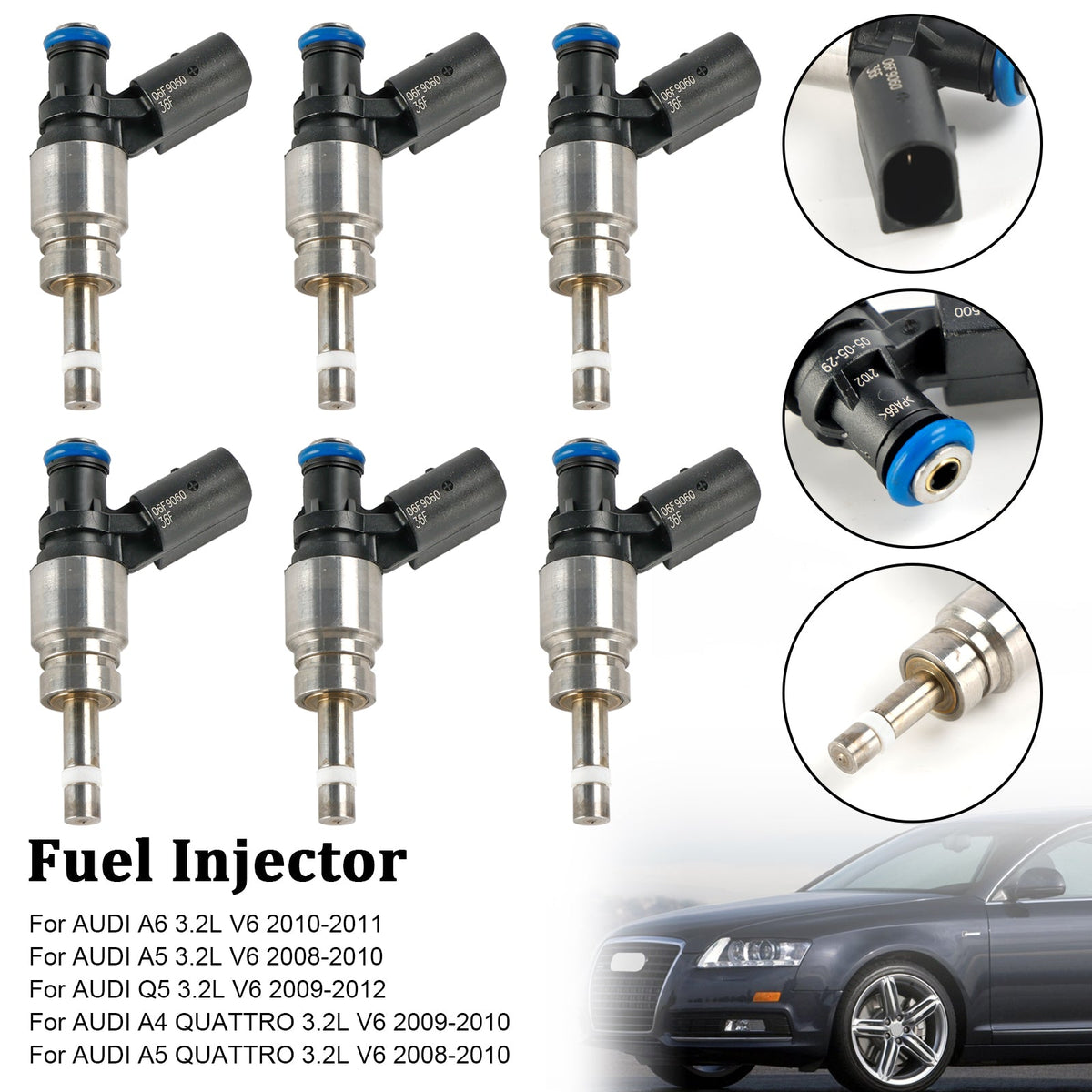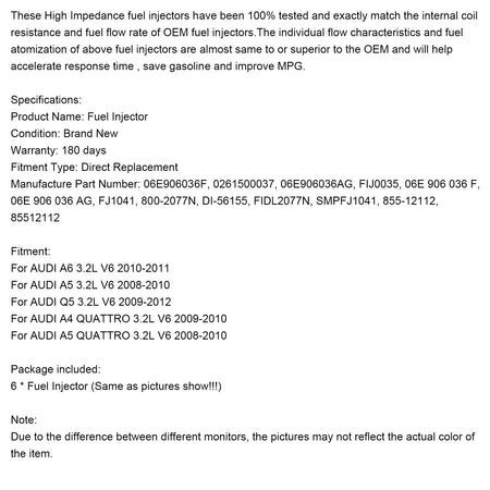 6 STüCKE Kraftstoffinjektor 06E906036F Fit Für Audi Q5 A4 A5 A6 3.2L V6 2008-2011 0261500037