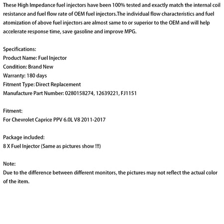 2011-2017 Chevrolet Caprice PPV 6.0L V8 8PCS Kraftstoffinjektor 12639221 0280158274