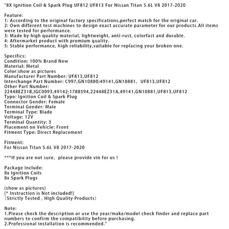 8x Zündspule & Zündkerze UF812 UF813 Passend für Nissan Titan 5.6L V8 2017-2020