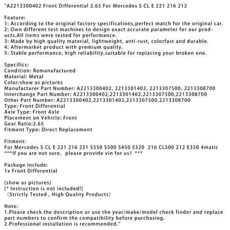 Mercedes S CL E 221 216 212 S550 S500 S450 S320 216 CL500 212 E350 4matic Vorderachsdifferential 2.65 A2213300402