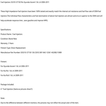 Areyourshop 4 Stück Einspritzdüsen 35310-37150 passend für Hyundai Accent 1.6L L4 2006-2011 Generic