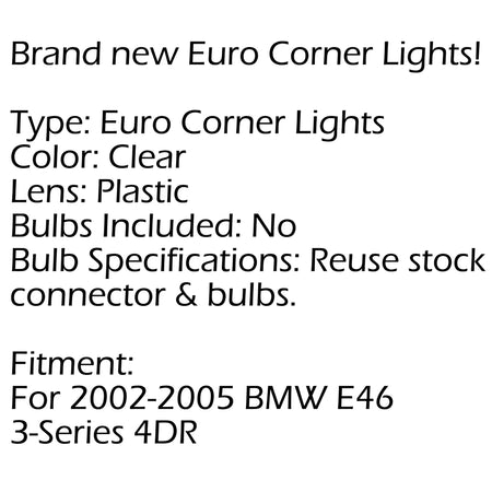 English Corner Lights For 2002-2005 BMW E46 3-Series 4DR Type: Euro Corner Lights Materials: High quality plastic material Compatible vehicles: Fit for 2002-2005 BMW E46 3-Series 4DR Package included: A Pair of Euro Corner Light(without bulbs) Three reasons for buying corner lights: For safety: the lights shell with worn surface, dirt inside the shell, yellowing aging material, all of which will affect the light transmittance of the bulb For beauty: the clean lights shell, classic unique European style, improve the level of your vehicle For quality: the product is made of high quality materials Deutsche Ecklichter Für 2002-2005 BMW E46 3er 4DR Typ: Euro Ecklichter Materialien: Hochwertiges Kunststoffmaterial Kompatible Fahrzeuge: Passend für den BMW E46 3er 4DR 2002-2005 Paket enthalten: Ein Paar Euro Corner Light (ohne Glühbirnen) Drei Gründe für den Kauf von Ecklichtern: Zur Sicherheit: Die Lichtschale mit abgenutzter Oberfläche, Schmutz in der Schale, vergilbtem Alterungsmaterial, die die Lichtdurchlässigkeit der Glühbirne beeinträchtigen Für die Schönheit: Die saubere Lichtschale im klassischen europäischen Stil verbessert das Niveau Ihres Fahrzeugs Für Qualität: Das Produkt besteht aus hochwertigen Materialien