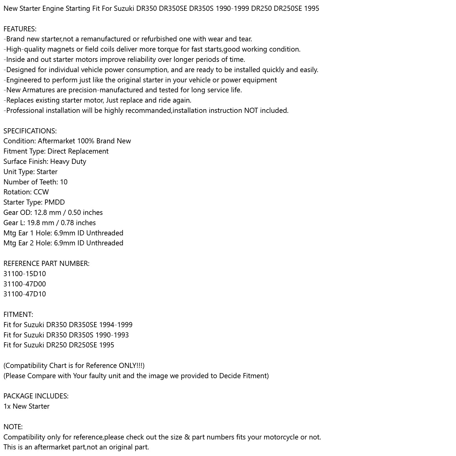 Neuer Startermotor Startanfall für Suzuki DR350 DR350SE DR350S 1990-1999 DR250 DR250SE 1995
