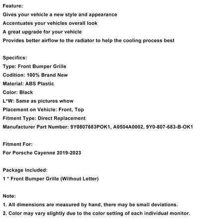 2019–2023 Porsche Cayenne, schwarzer Frontstoßstangengrill, 9Y0807683POK1