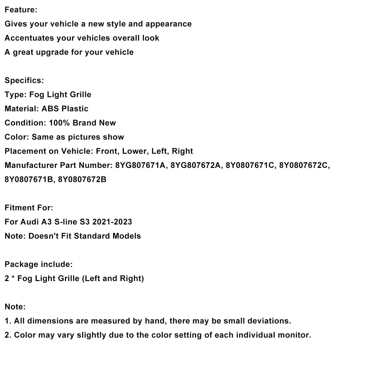 Schwarze Front Honeycomb Nebelscheinwerfer Kühlergrill Abdeckung Fit Audi A3 S-line 2021-2023