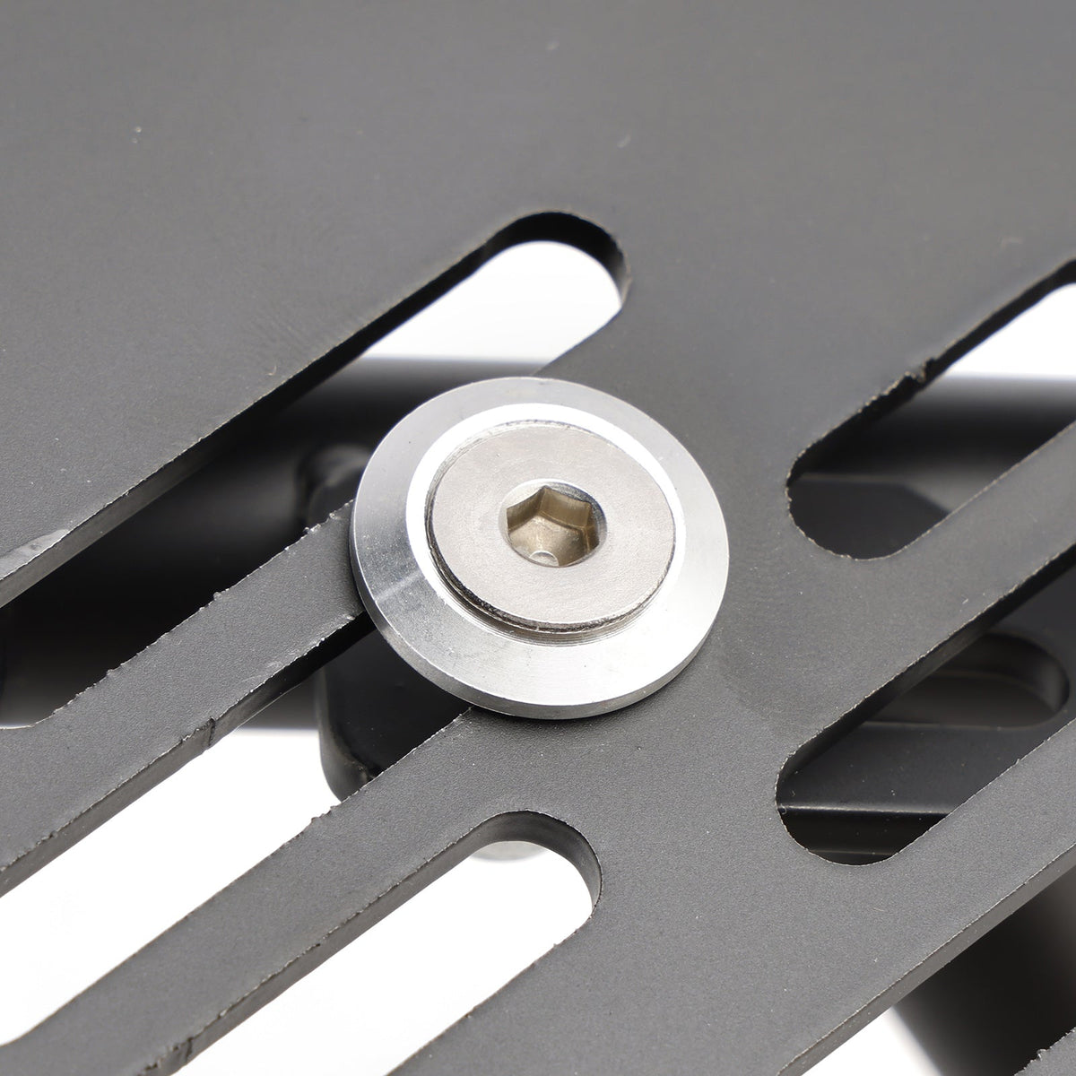 Aus 3mm Aluminium, mit integrierten Schlitzen für Sicherheitsgurte, inkl. Befestigungsmaterial zur Befestigung an vorhandenen Gepäckträgern.