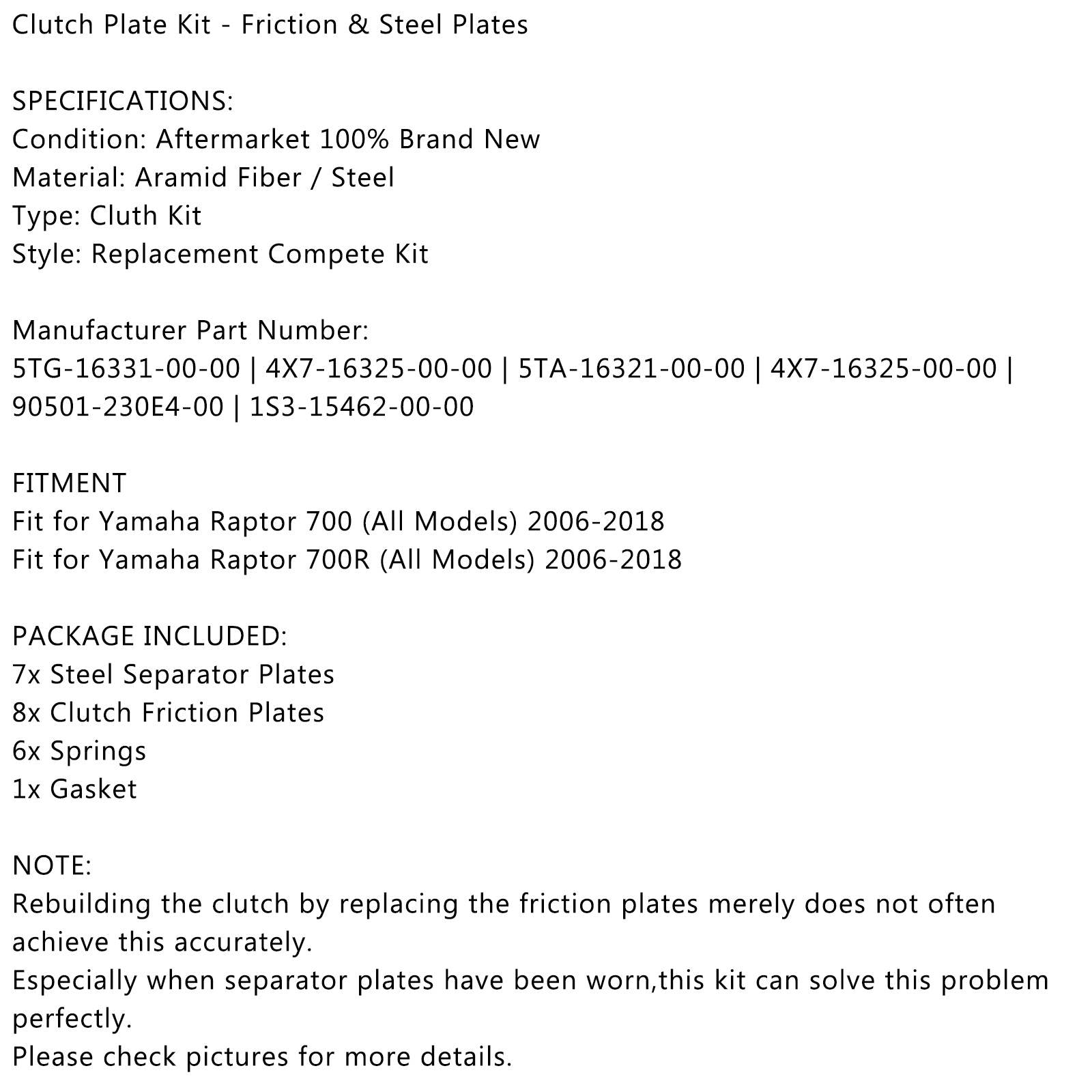 Areyourshop Clutch Kit Disks Discs Springs Gasket fit for Yamaha Raptor 700 700R 2006-2018