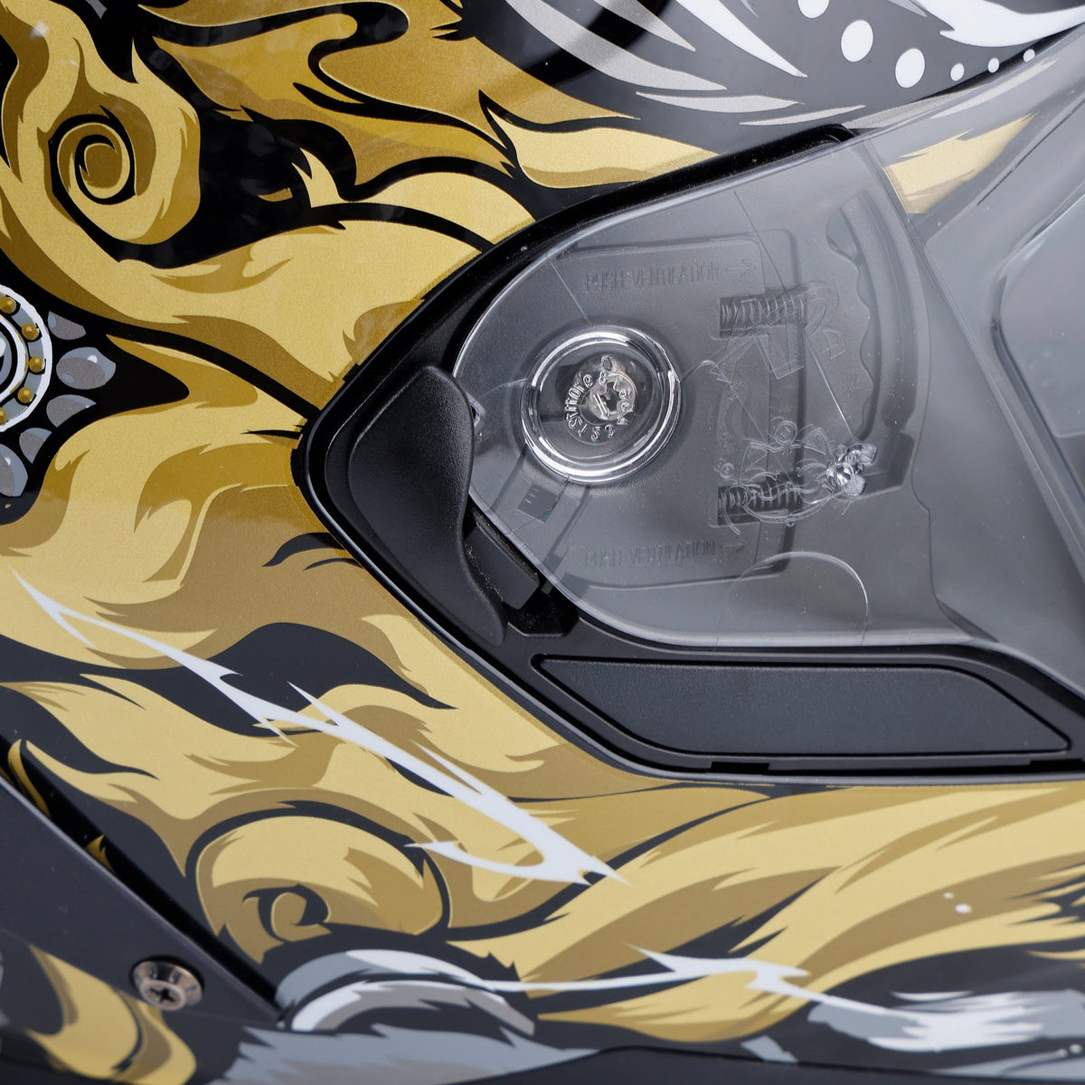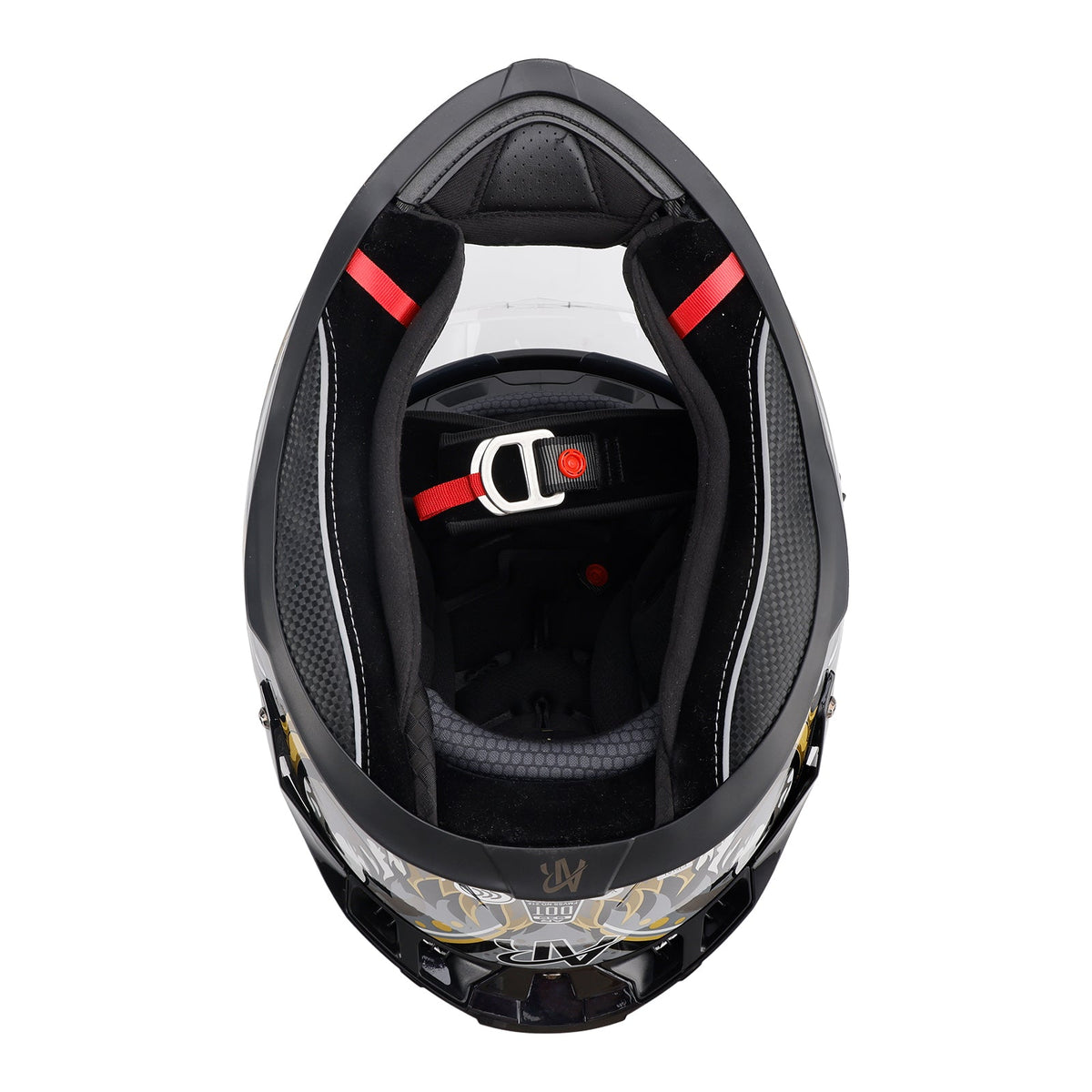 Der Integralhelm ist mit einer modernen Verbundschale ausgestattet, die die Sicherheitsnormen FMVSS Nr. 218 und DOT erfüllt oder übertrifft, ist nach ECE 22.05 zertifiziert und gewährleistet, dass Sie während der Fahrt vor Stößen und Abschürfungen geschützt sind. Der verstärkte Kinnriemen mit sicherem Schnallensystem bietet zusätzliche Sicherheit und ist einfach zu verwenden.