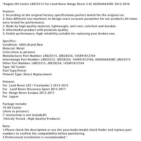 Motorölkühler LR025515 Für Land Rover Range Rover 2.0L AG9G6A642BC 2012-2016
