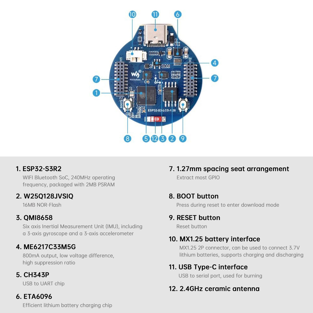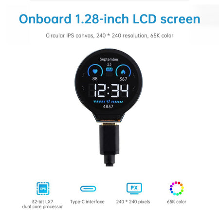 Integrierter 1,28-Zoll-LCD-Bildschirm, rundes IPS-Panel, Aufl?sung 240 x 240, 65.000 Farben. Integrierte sechsachsige Tr?gheitsmesseinheit QMI8658 (3-Achsen-Beschleunigung, 3-Achsen-Gyroskop), kann Bewegungshaltungen erkennen.
