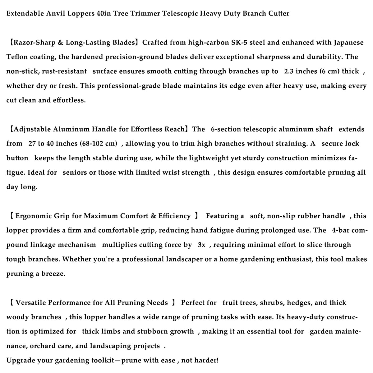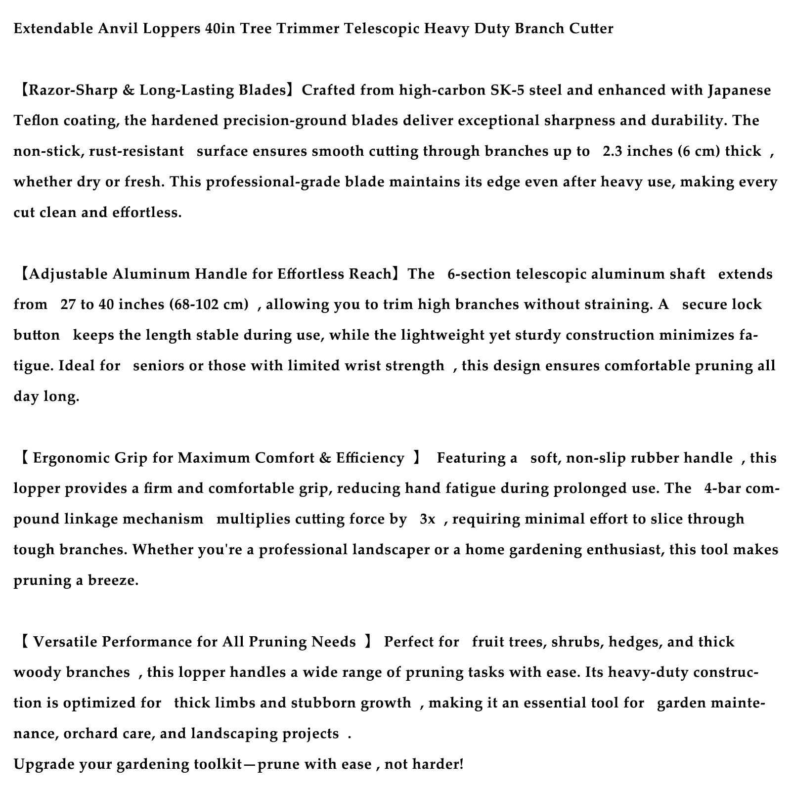 【 Versatile Performance for All Pruning Needs 】 Perfect for fruit trees, shrubs, hedges, and thick woody branches , this lopper handles a wide range of pruning tasks with ease. Its heavy-duty construction is optimized for thick limbs and stubborn growth , making it an essential tool for garden maintenance, orchard care, and landscaping projects .